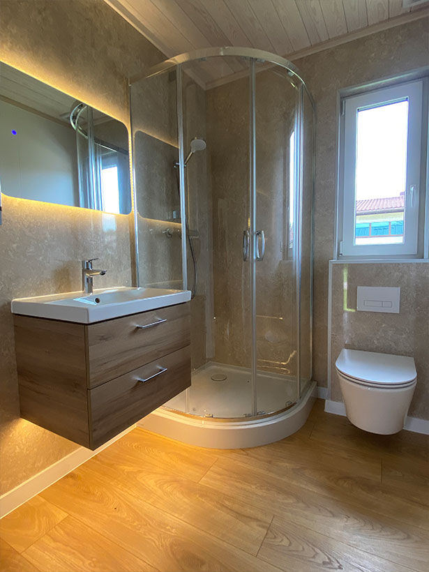 Jedes Haus verfügt über ein komplettes Badezimmer, das mit allen notwendigen Geräten ausgestattet ist. Lediglich der Anschluss von Versorgungsleitungen ist erforderlich, um das Haus voll nutzbar zu machen.